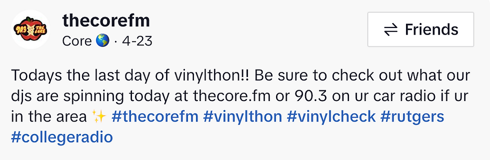 At 90.3 the Core, we have a large Vinyl library, but a lot of inexperienced and hesitant DJs! In hopes to make this fun and historic way of playing music on radio more accessible to DJs, I led our efforts to engage our DJs and engage our audience- hopefully to inspire participation (which it did!).
